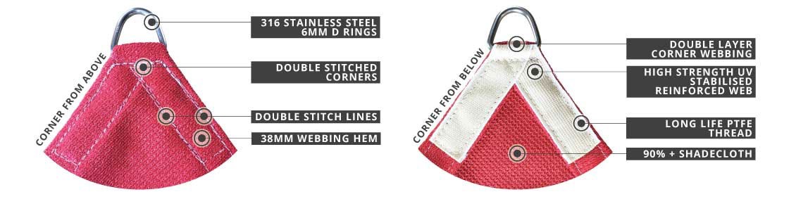 State of the Art Shade Sail technology and hardware, premium stainless hardware, UV resistant long lasting materials, professional installation and more...